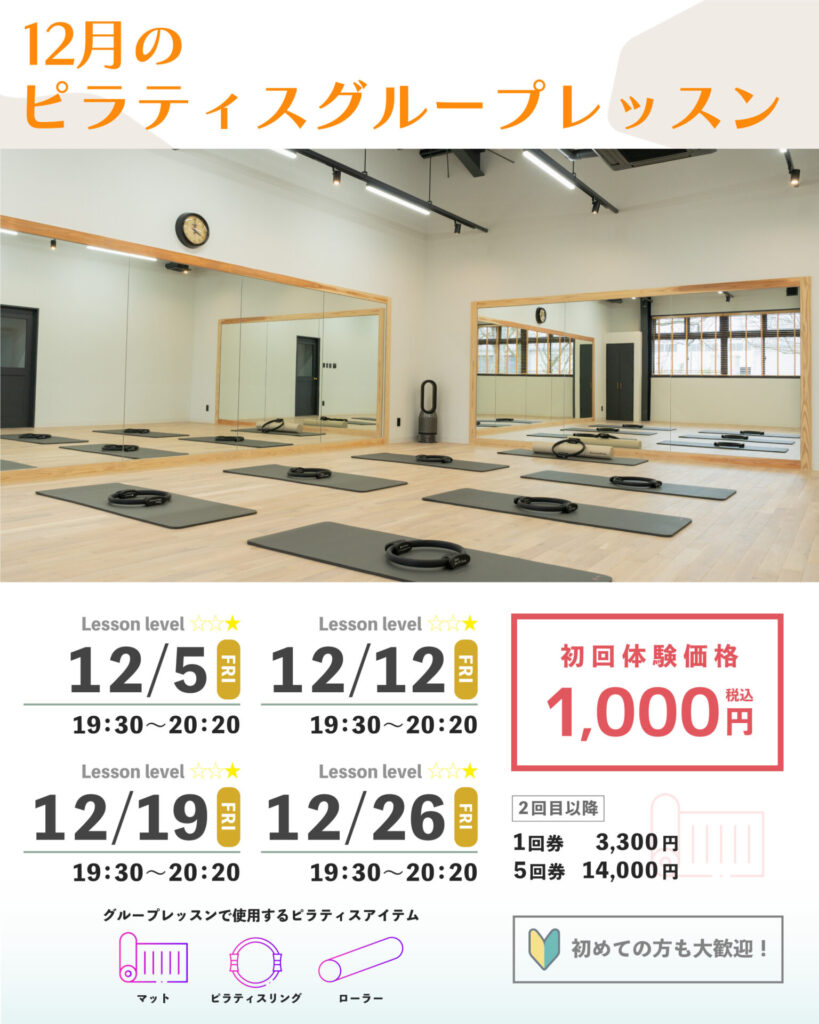 12月のピラティスグループレッスンのスケジュールを公開いたします。