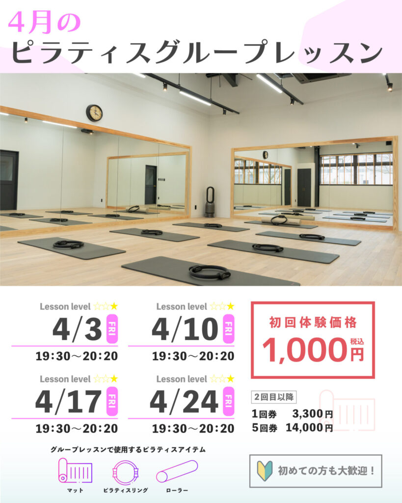 4月のピラティスグループレッスンのご案内です。